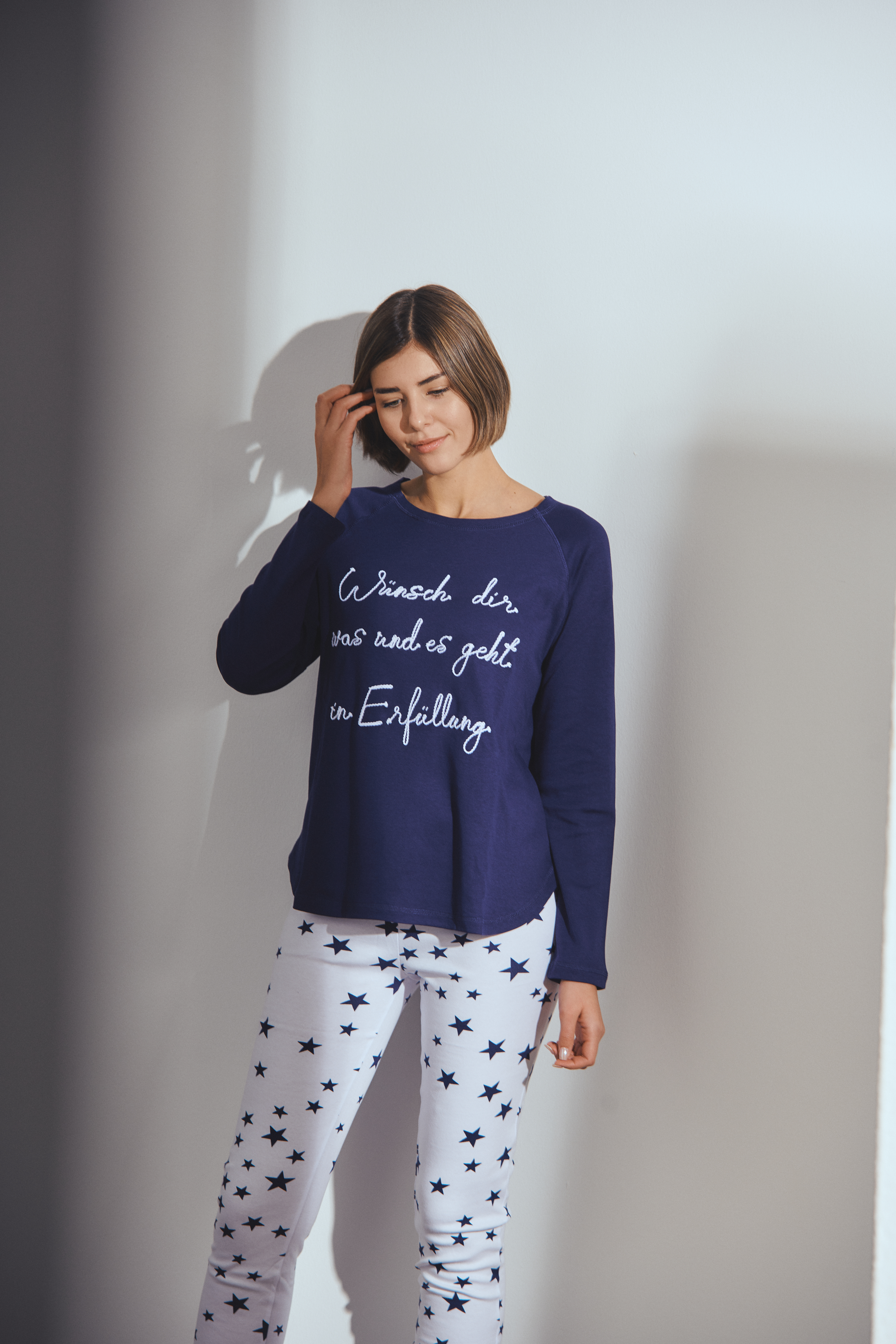 Produktinformationen Pyjama Damen Bündchen "Wünsch dir was", dunkelblau/ weiß allover