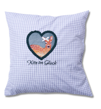 Ein süßes Kitz schmückt dieses Kissen und lädt zum Träumen ein. Kissenhülle mit hochwertiger Herzapplikation auf grauem Vichy Stoff.