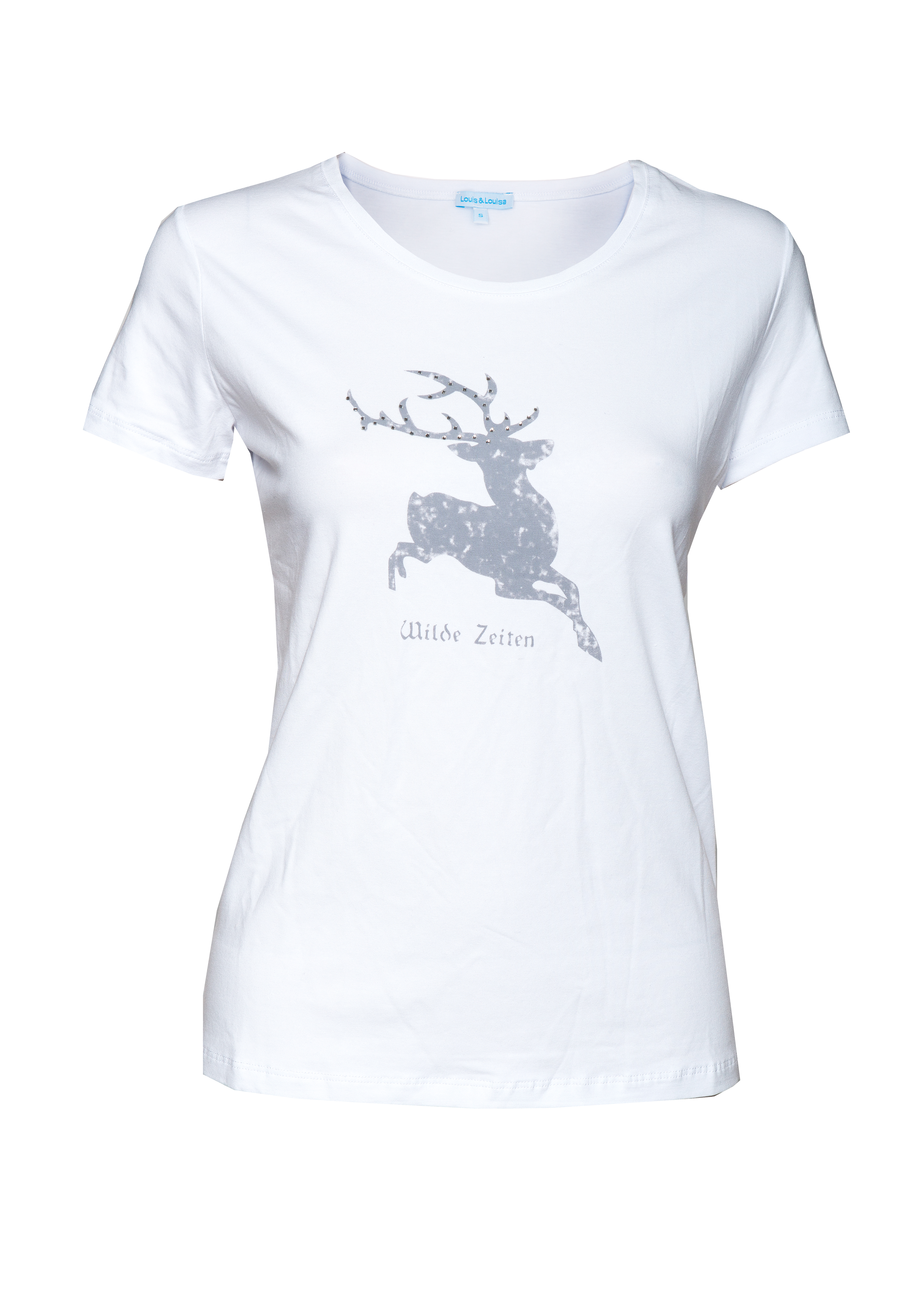 Achtung Wildwechsel! Weißes Shirt mit gedrucktem Hirsch in Camouflage Optik und Glitzersteinen am Geweih.